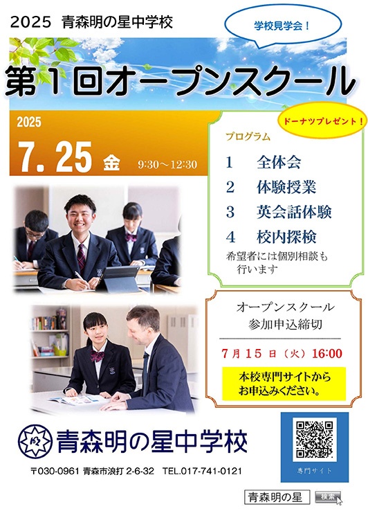 入試情報2025.07.11中学校 第1回オープンスクールのお知らせ 中学校 第1回オープンスクールのお知らせです。 日時 7月25日(金)9:30~12:30 内容 全体会、体験授業、英会話体験、校内探検 締切は15日(火)に延長しました。 こちらからお申込ください。