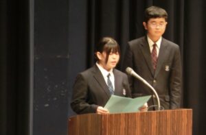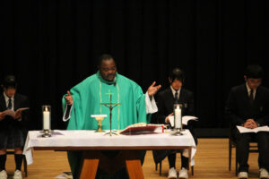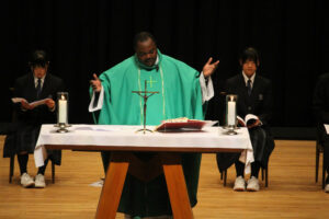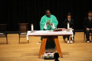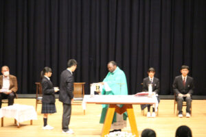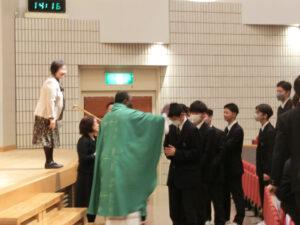 神父様の講話の後、ミサが行われ、侍者、聖書朗読、奉納、共同祈願を代表の生徒がつとめました。