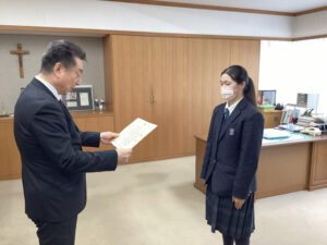2025.12.09税に関する高校生の作文 青森税務署長賞 国税庁 主催 税に関する高校生の作文 青森税務署長賞 高校2年 福井 賀梛 12月3日(水)に青森税務署長が来校し、校長室において表彰式を行いました。