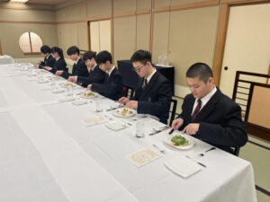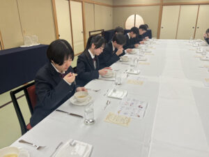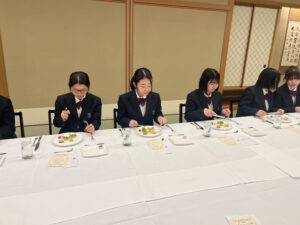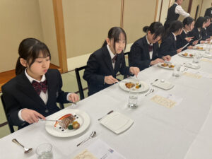 2026.02.25中学2年 テーブルマナー教室 2026年2月20日(金) 中学2年生は総合的な学習の時間にテーブルマナー教室を行いました。 アップルパレス青森さんに御協力いただき、ホテルの方から洋食のテーブルマナーを教えていただきながら、美味しく学んできました。