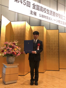 2026.02.27全国高校生読書体験記コンクール 全国高等学校長協会賞受賞 公益財団法人 一ツ橋文芸教育振興会 主催 第45回全国高校生読書体験記コンクール 全国高等学校長協会賞 高校3年 船橋 拓実 船橋さんの作品は、全国5万5千961編の応募作品の中から第2位の作品として選ばれ、1月26日に東京ドームホテルで行われた表彰式に出席しました。 また、明の星高等学校は学校賞を受賞し、集英社文庫100冊が寄贈されました。 本校の図書館には100冊文庫でコーナーが作られ、船橋さんはとても喜んでいる様子でした。