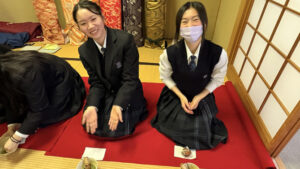 まずはじめに、挨拶、立ち居、歩き方、ふすまの開け閉め、床の間の拝見の仕方など、畳の部屋の所作、作法を体験。お茶菓子と抹茶のいただき方を学び、茶道部の生徒のお点前を見せてもらいました。